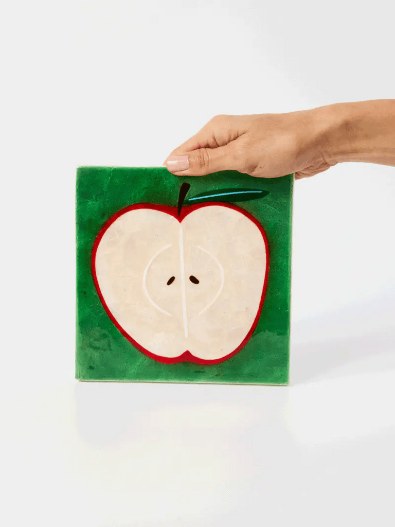 An apple a day, makes your wall feel fabulous. This apple wall tile is painted on green capiz with deep red trim and a modern, graphic twist. Stack it with other Superette tiles or hang it in the kitchen.